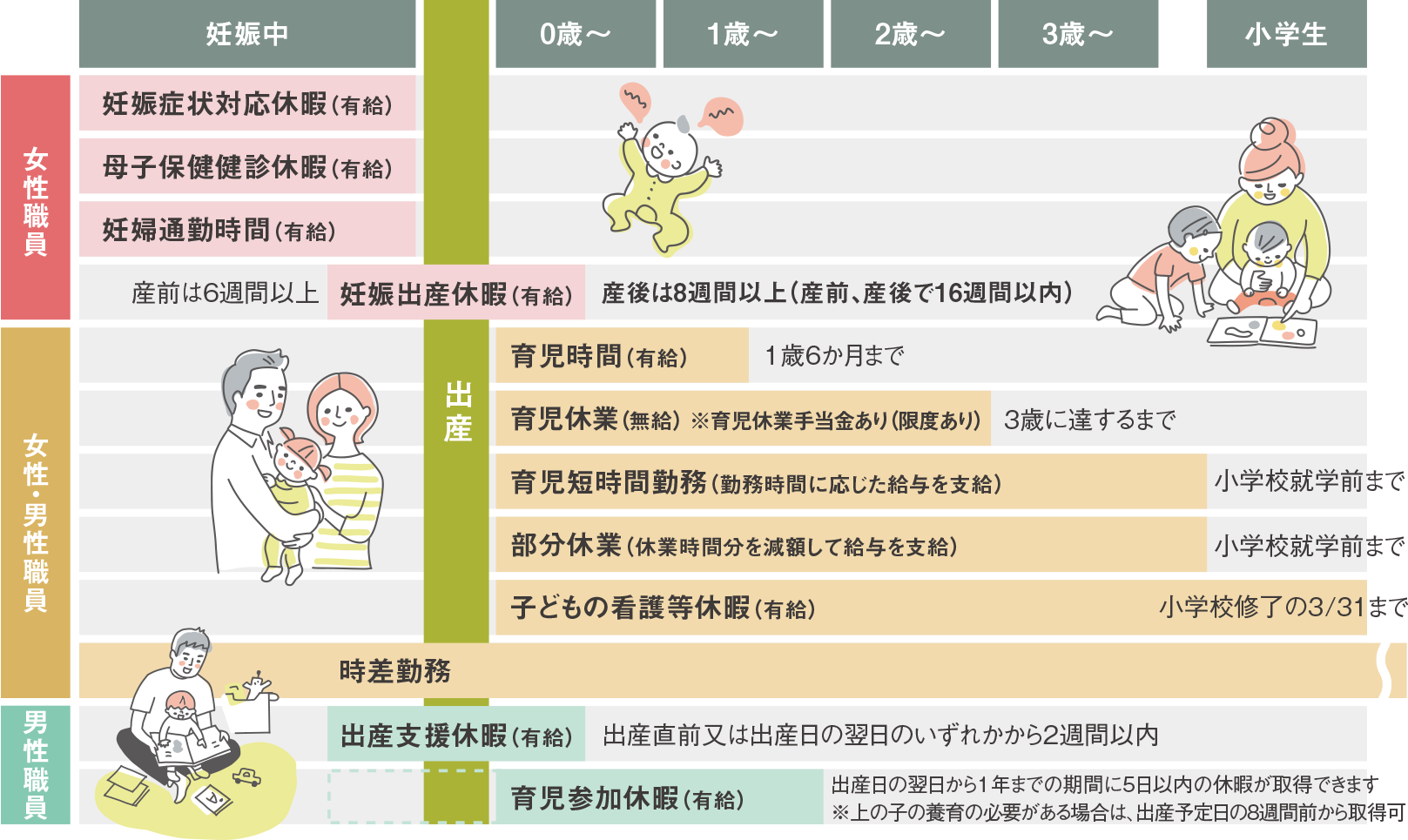 ※出産支援休暇、育児参加休暇は、女性職員が同性のパートナーシップ関係にある場合も取得可能です。